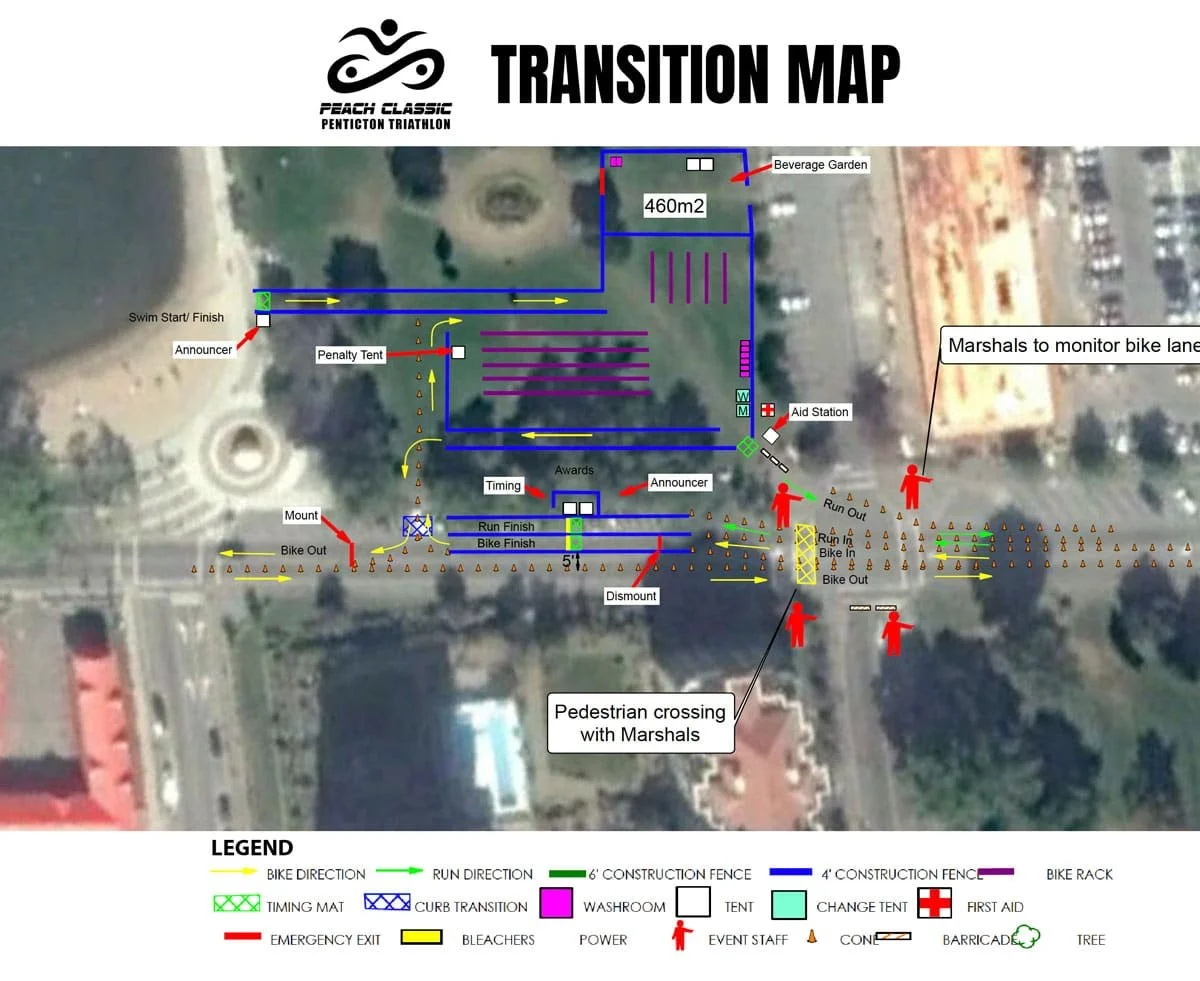 Note: The bike dismount line (monitored by Triathlon BC Officials) will be located several meters in front of a Bike Course finish banner. The timing mat is at the Bike finish after the dismount line. This will be the ‘bike in’ time for all events. All turnaround locations are fully monitored and controlled. Course maps are subject to final approval.