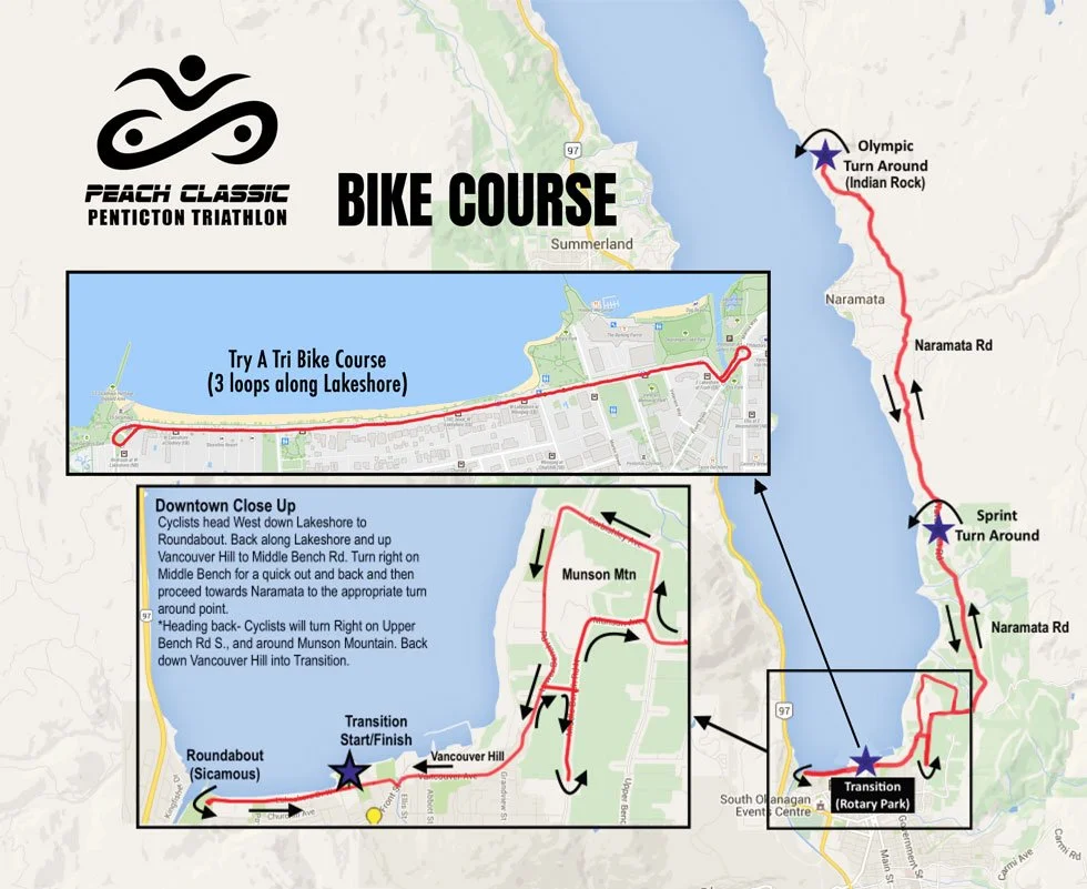 From the transition area all athletes will head west along Lakeshore Drive to the roundabout at the famous S.S Sicamous Boat then back along Lakeshore Drive and up Vancouver Hill. At the top of the hill, cyclists will do an out-and-back loop using Middle Bench and Tupper intersections. Athletes wil then travel out to Naramata Road to the end turnaround points for each distance.